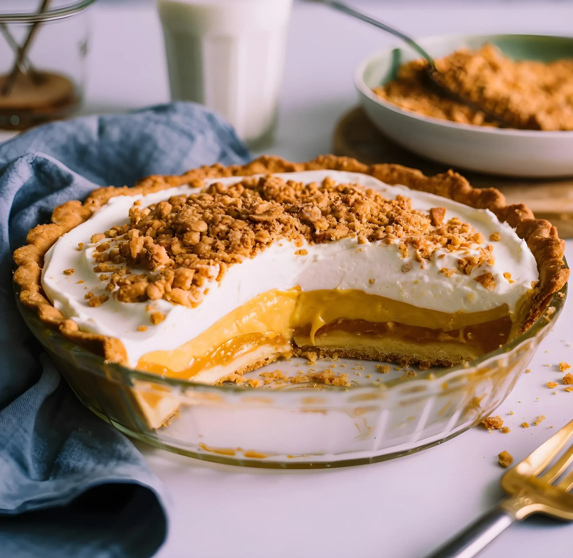 Set aside half of your crumbs for layering the base of the pie. Keep the rest for that irresistible topping. The crumble layer adds both flavor and texture it’s what sets this pie apart from ordinary pudding pies.