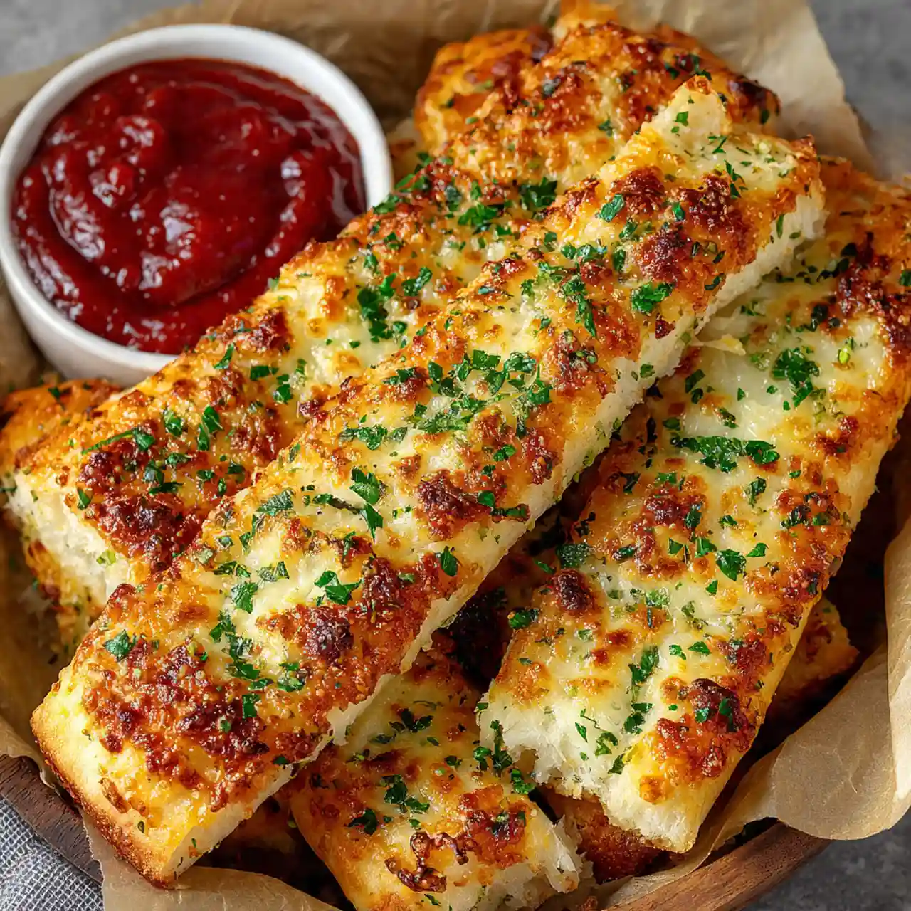 Garlic Breadsticks are golden on the outside and soft on the inside, brushed generously with garlic butter and herbs. They’re simple, classic, and always popular. Serve them alongside marinara sauce for dipping at parties or holiday gatherings.