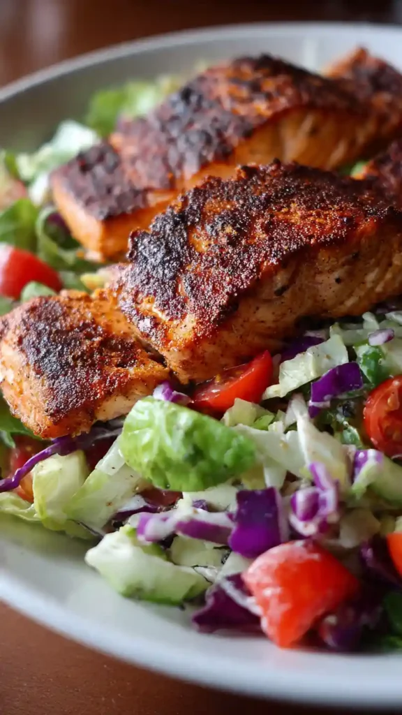 A bold and healthy salad featuring smoky blackened salmon served over fresh greens with a light dressing. Perfect for a quick dinner or nutritious lunch.