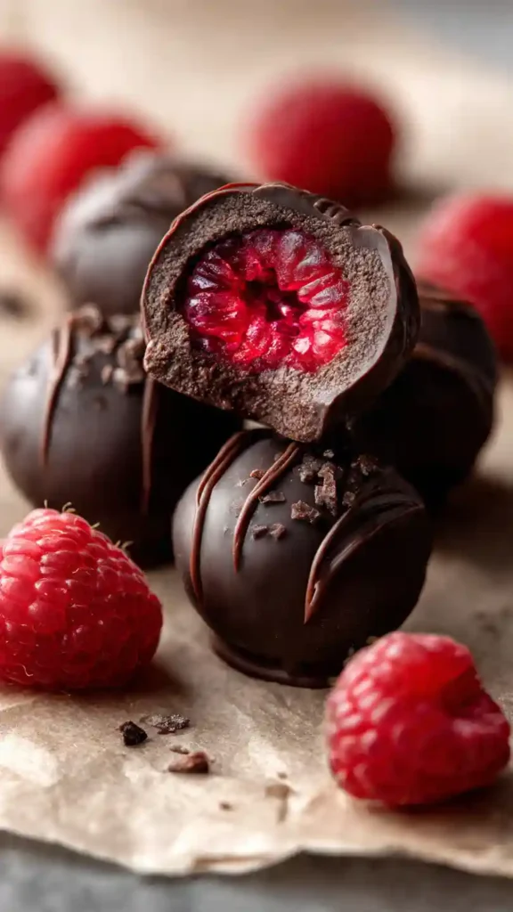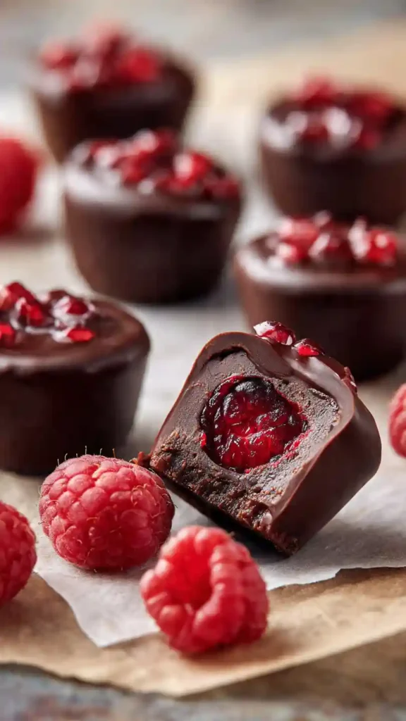 These Chocolate Raspberry Bites are intensely chocolatey with a smooth, melt-in-your-mouth texture. The chocolate coating is rich and slightly bittersweet, while the raspberry center adds a fresh, tart pop that keeps each bite from feeling too heavy.