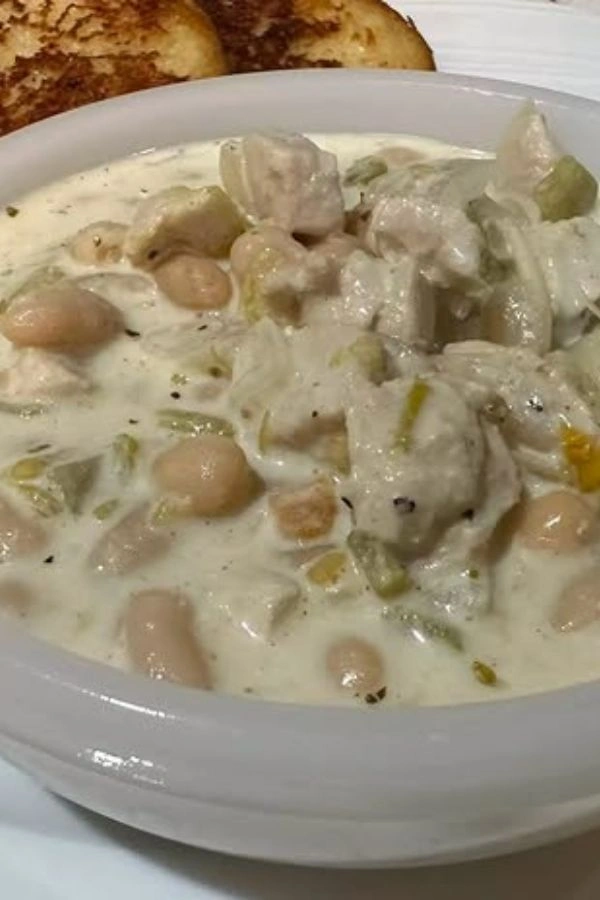 Serve the creamy white chicken chili in bowls. Top with fresh cilantro, a squeeze of lime, and extra cheese if you like. Serve with tortilla chips, crusty bread, or a side of rice for a complete meal.