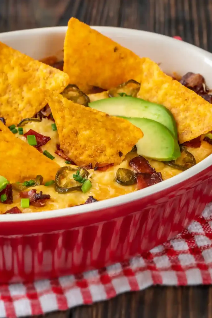 Bake right before serving The dip stays hot and the topping stays crisp.