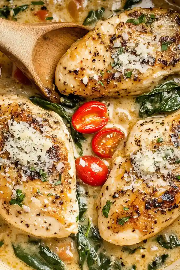 Add fresh spinach to the sauce and let it wilt. Return the chicken to the skillet and spoon sauce over the top. Simmer until the chicken is fully cooked and tender.