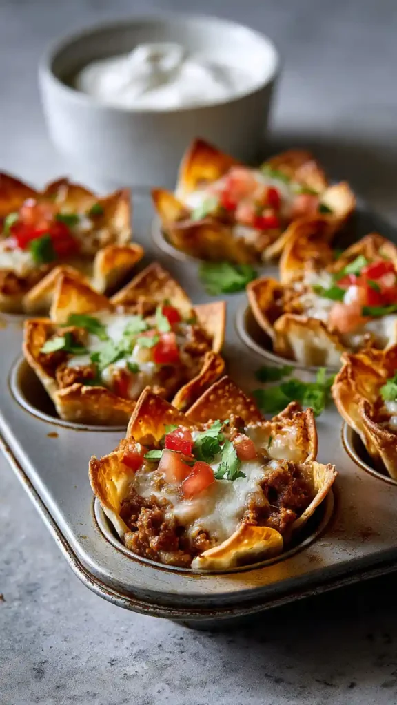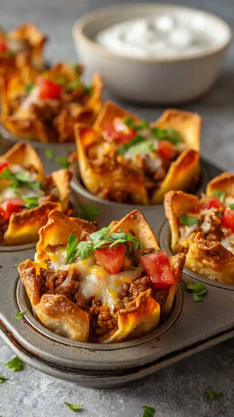 If you want something fun, crunchy, and guaranteed to disappear fast, Mini Taco Cups are a must. They’re baked in muffin tins using wonton wrappers, which turn golden and crisp while holding a savory taco filling inside.