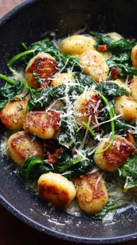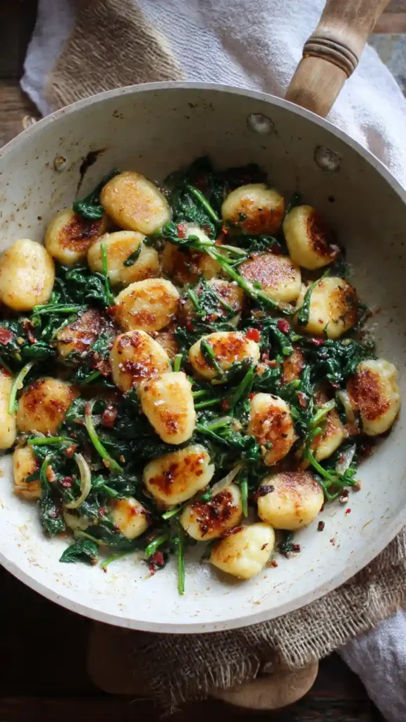 Pan fried gnocchi with spinach is one of those underrated meals that delivers big on texture and flavor with very little effort. Instead of boiling, the gnocchi are cooked in a skillet until golden and slightly crispy on the outside while staying soft inside.
