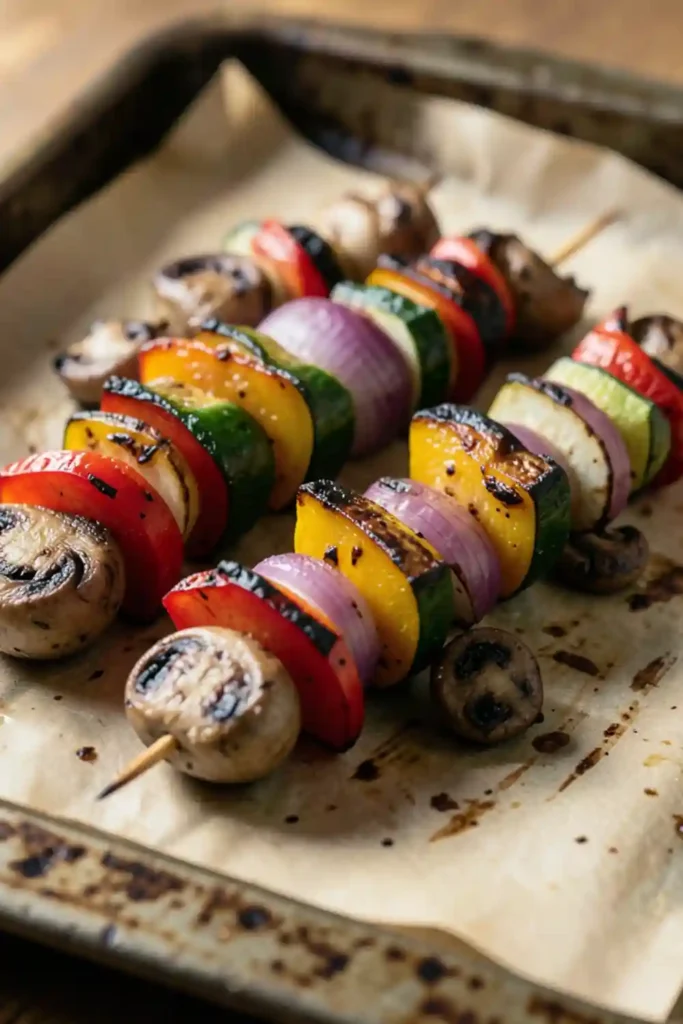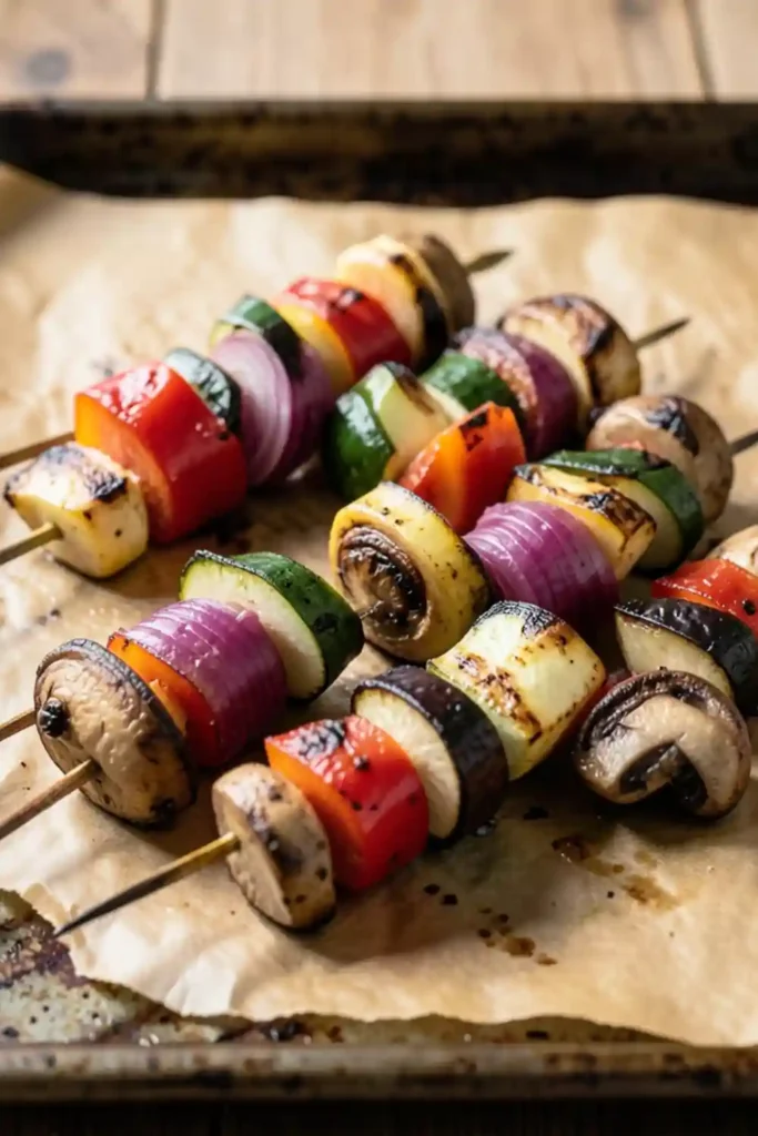 Roasted veggie skewers are savory and lightly caramelized with a tender bite. The vegetables develop natural sweetness in the oven, balanced by simple seasoning that keeps the flavors clean and fresh rather than heavy.
